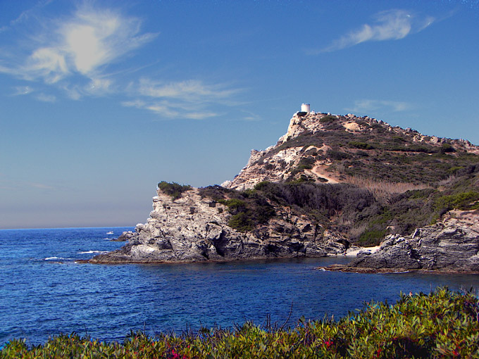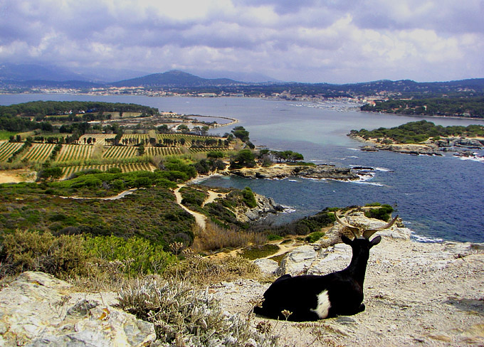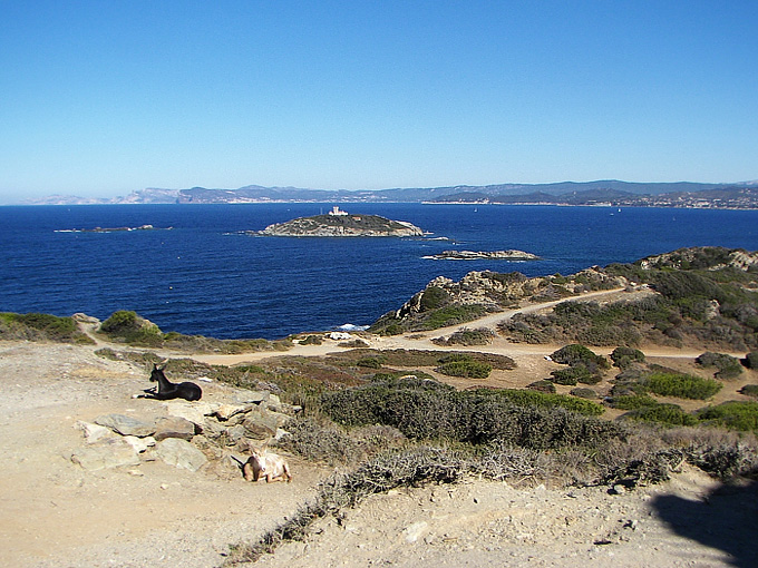 Blick vom Aussichtturm: Die Westküste von Embiez mit Ziege,
