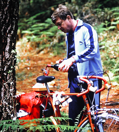 Die Straße ist immer noch die D652 und sie führt immer noch, wie gehabt, meist schnurgerade durch lichtgrünen Pinienwald. Ich komme gut voran, erreiche bald den Badeort Vieux-Boucau-les-Bains, lasse ihn rechts liegen, und wechsle kurz darauf zur D79 in Richtung Capbreton. Gegen Mittag lichten sich die Wolken allmählich und der Regen lässt nach, eine gute Gelegenheit für eine kurze Rast. In einem Waldweg genehmige ich mir zur Stärkung ein Gläschen Bordeaux und absolviere anschließend einen kleinen Waldlauf.