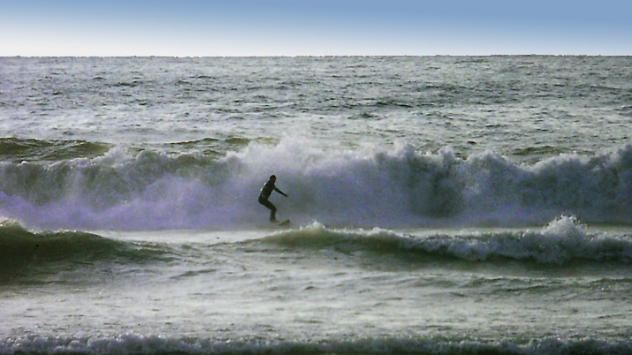 Kurze Zeit später, es geht bergab, befinde ich mich auf einem menschenleeren Strand. Ein einsamer Surfer tummelt sich in der Brandung.Wie mag es hier wohl zur Hauptsaison aussehen? Ich bleibe noch bis die Sonne hinter dem Horizont versinkt und mache mich dann auf den Heimweg.
