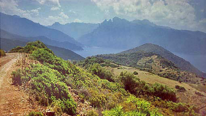 Nur mäßig erschöpft erreiche ich den Kulminationspunkt. Die Aussicht hier oben steht der vom 'Col de Palmerella' in nichts nach. Ringsum eine phantastische Bergwelt und im Süden, im Gegenlicht gleißend, der Golf von Porto, und dahinter, schroff aufragend, rötliches Granitgebirge.